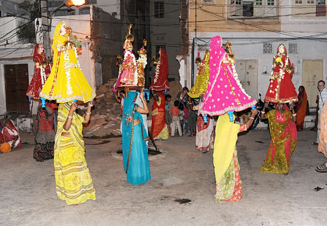 Gangaur is one of the most important festivals in Rajasthan. In some form or the other, it is celebrated all over Rajasthan. “Gan” is a synonym for Lord Shiva & “Gauri” or “Gaur” stands for Goddess Parvati, the heavenly consort of Lord Shiva. Gangaur celebrates the union of the two and is a symbol of conjugal & marital happiness. Gangaur is celebrated in the month of Chaitra (March-April), the first month of the Hindu calendar. This month marks the end of winter & the onset of spring. This festival is celebrated especially by women, who worship clay idols of “Gan” & “Gauri” in their houses. These idols are worshipped by unmarried girls who seek the blessings of Gan & Gauri for a good husband, while the married women pray for the good health and long life of their husbands. This worship which starts from the first day of the chaitra month culminates on the 18th day into Gangaur festival with a great religious fervor. On the eve of Gangaur festival, women decorate their palms and fingers with henna. The idols of Gan and Gauri are immersed in a pond or in a nearby lake on the last day of the festival. A traditional procession of Gangaur commences form the Zanani-Deodhi of the City Palace, passing through Tripolia Bazaar, Chhoti Chaupar, Gangauri Bazaar, Chaugan stadium and finally converges near the Talkatora. The procession is headed by a colorful pageantry of old palanquins, chariots, bullock carts and performing folk artists.